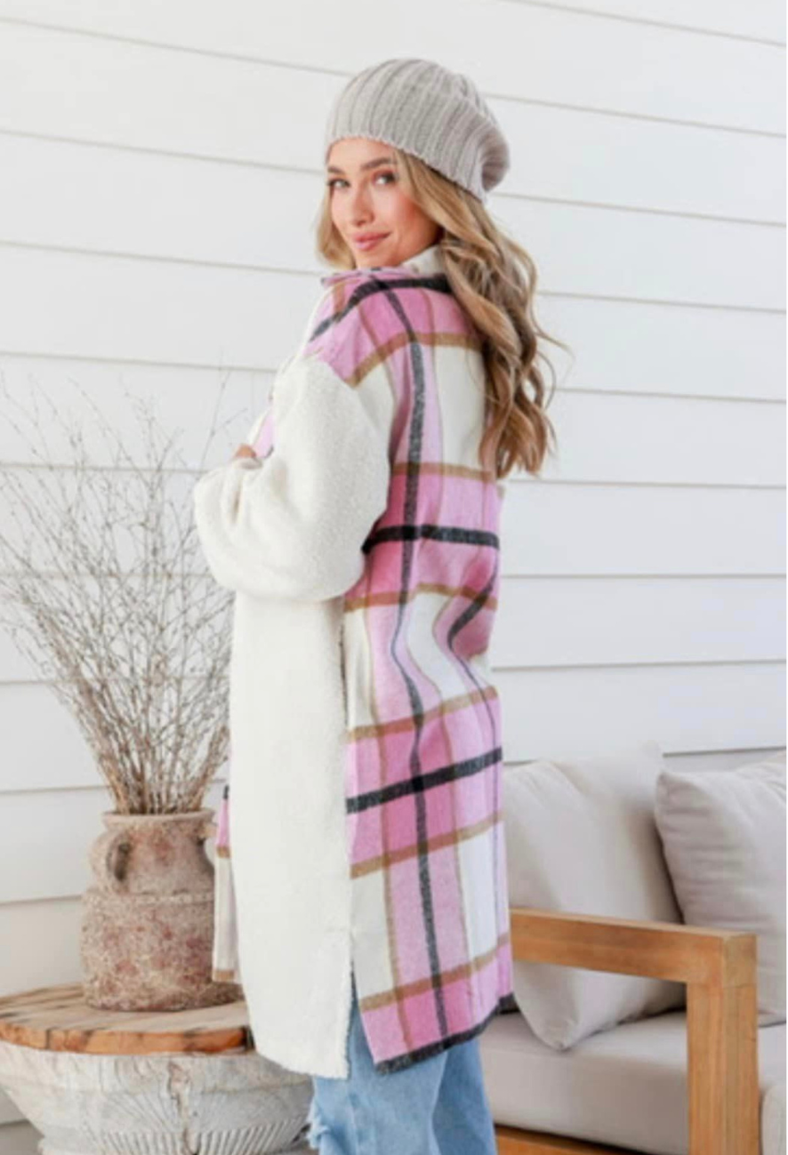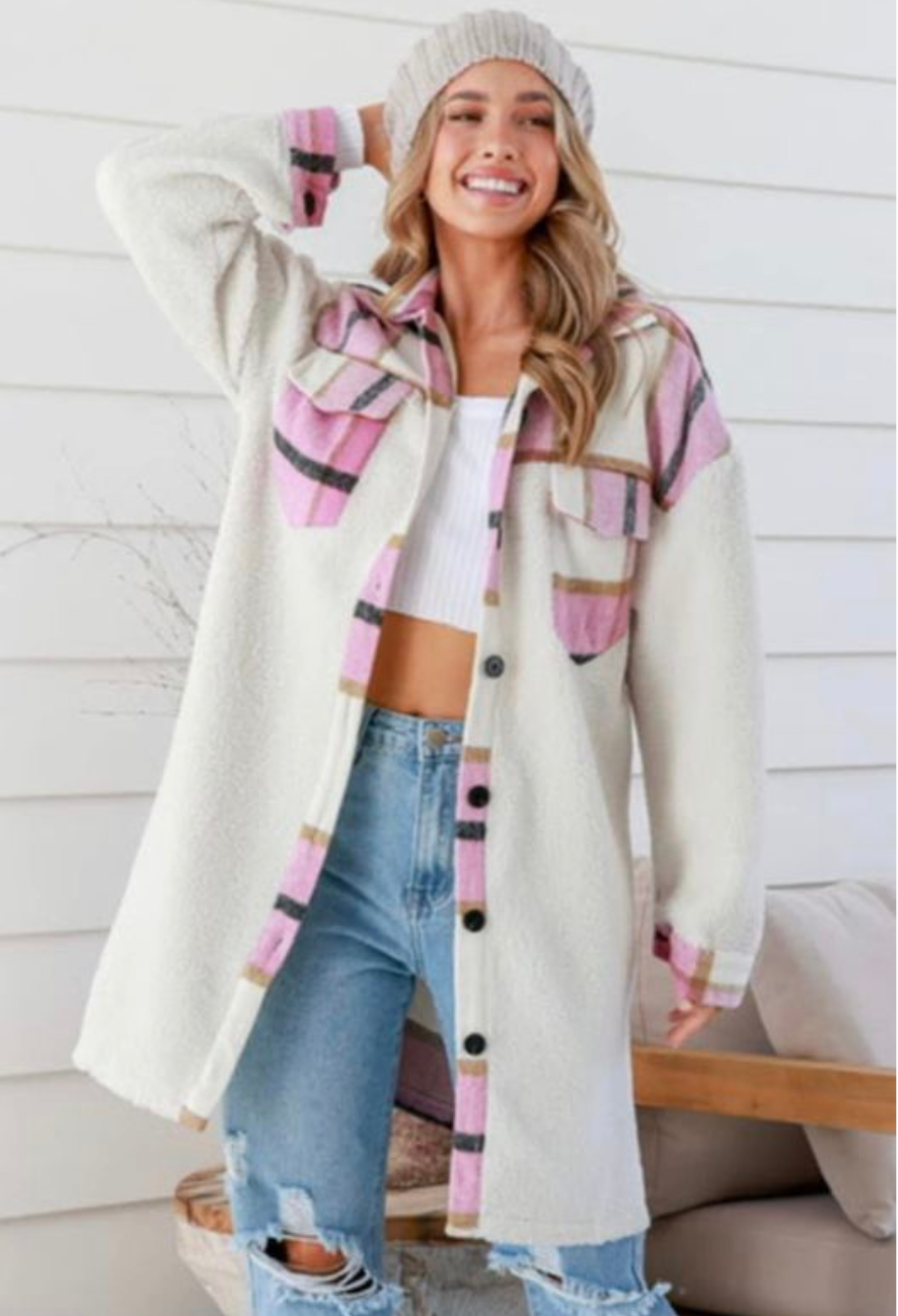 Long line sherpa jacket, full button front, collared, 2 front high packets, 2 side pockets , full length sleeves
