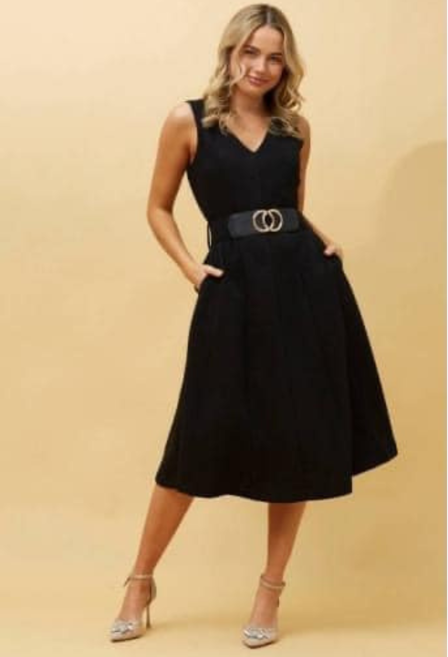 v neck, fully lined, zipper at back, removable elastic thick black belt with gold buckle , 2 side pockets