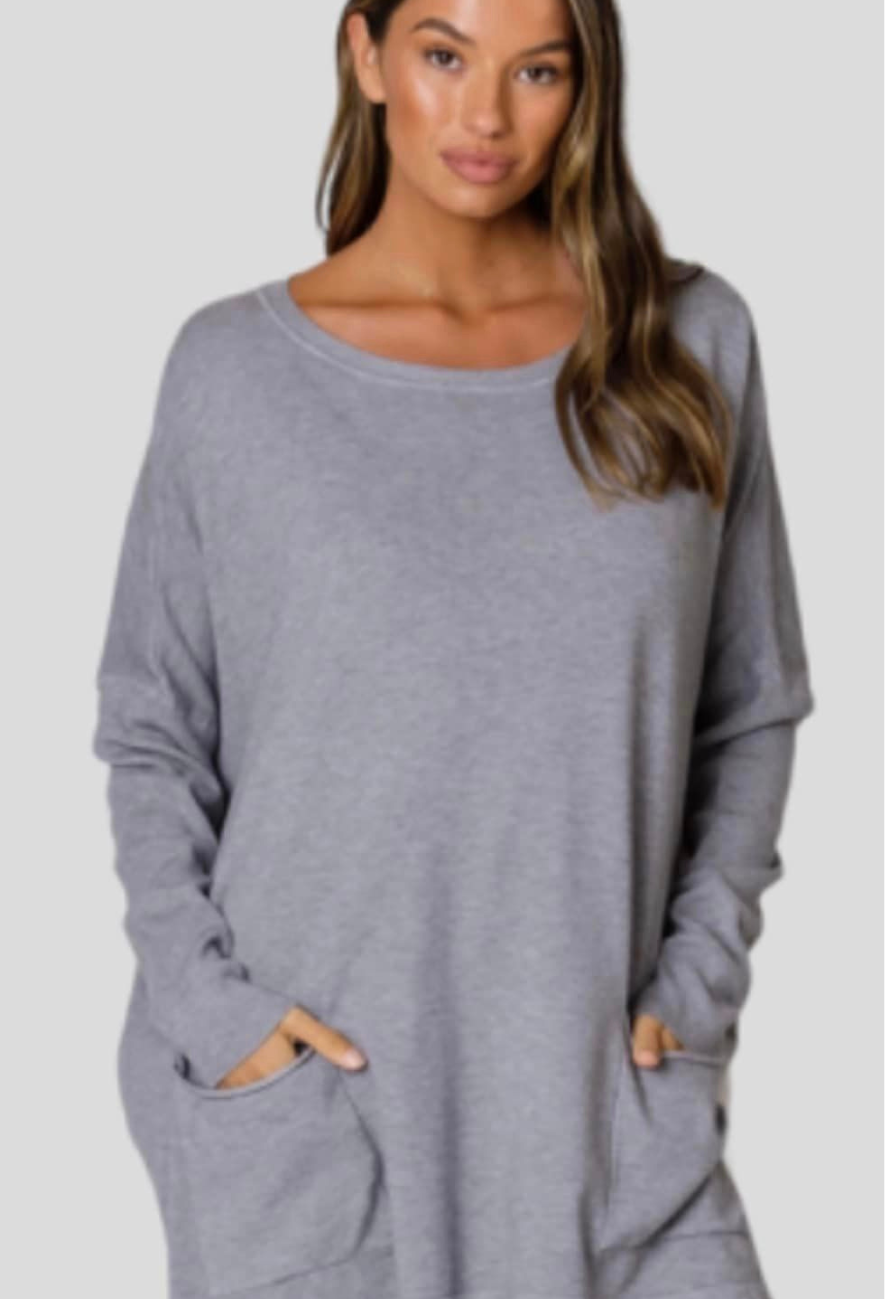 a S/M will fit up to a size 12 cotton blend round neck, super soft, 2 front pockets